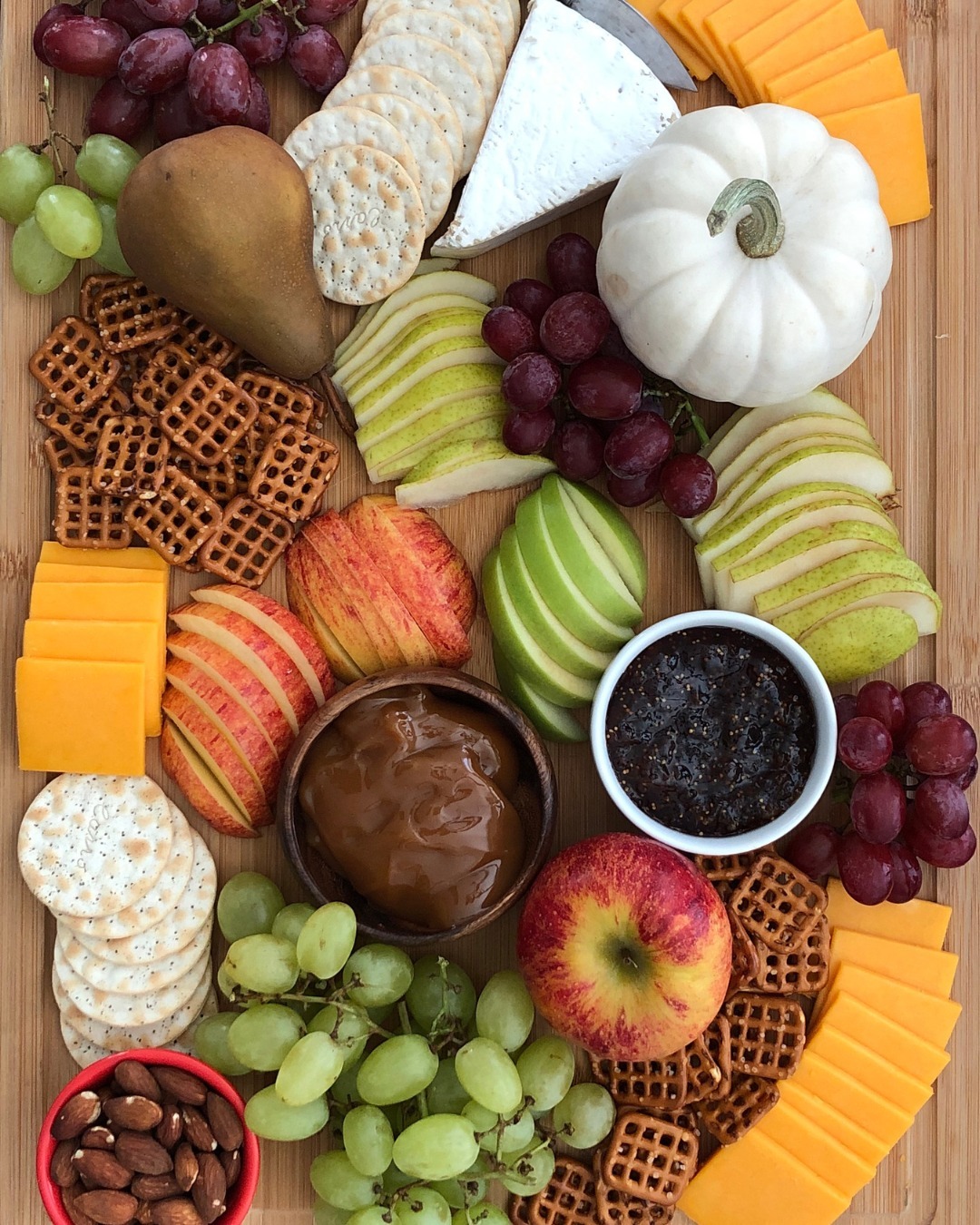 A little bit of everything—fruits, cheeses, spreads—that mirrors a stroll through your favorite farmers market in October.